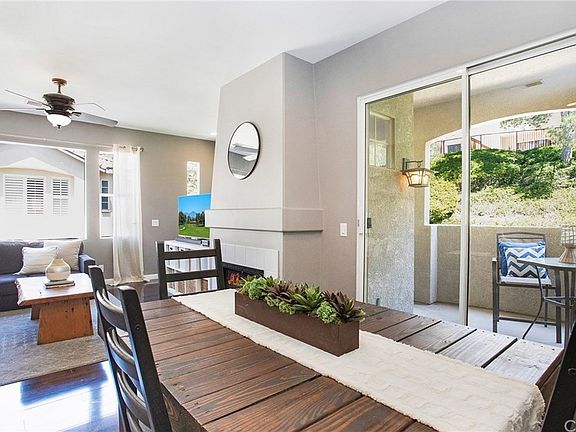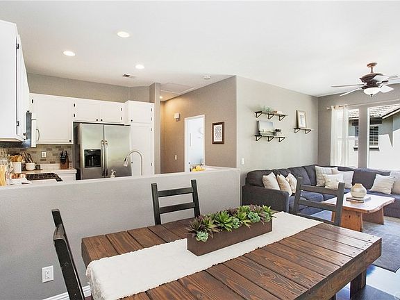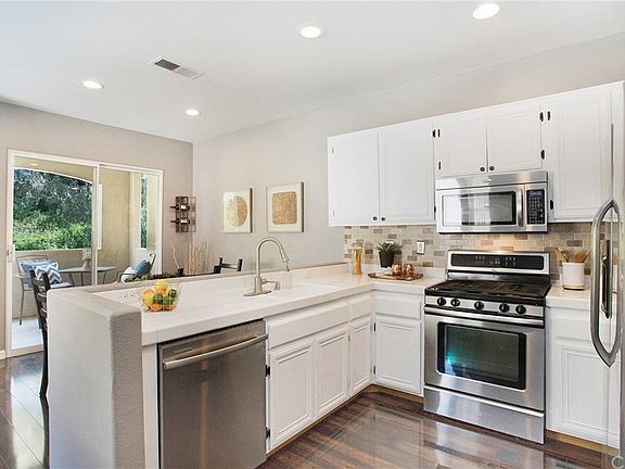 Stunning end unit with a private entry way! Great floor plan that has lots of light! Including white and bright kitchen with new tile backsplash. Wood kitchen cabinets with recessed lighting. Laminate dark wood color flooring throughout. Great views of the trees and greenery off the patio and kitchen. Walking distance to community pool facility. Spacious direct access garage with washer/dryer hookups. All bedrooms on the 2nd floor. AC unit is only 5 years old. And NO MELLO ROOS! Great opportunity here!