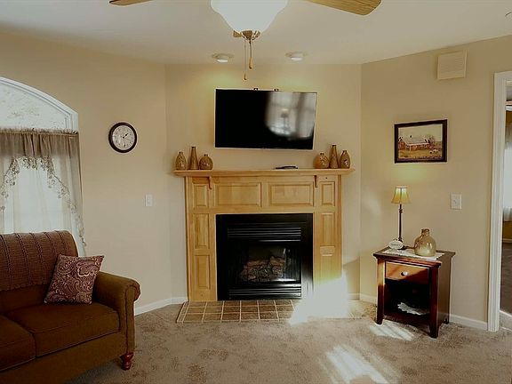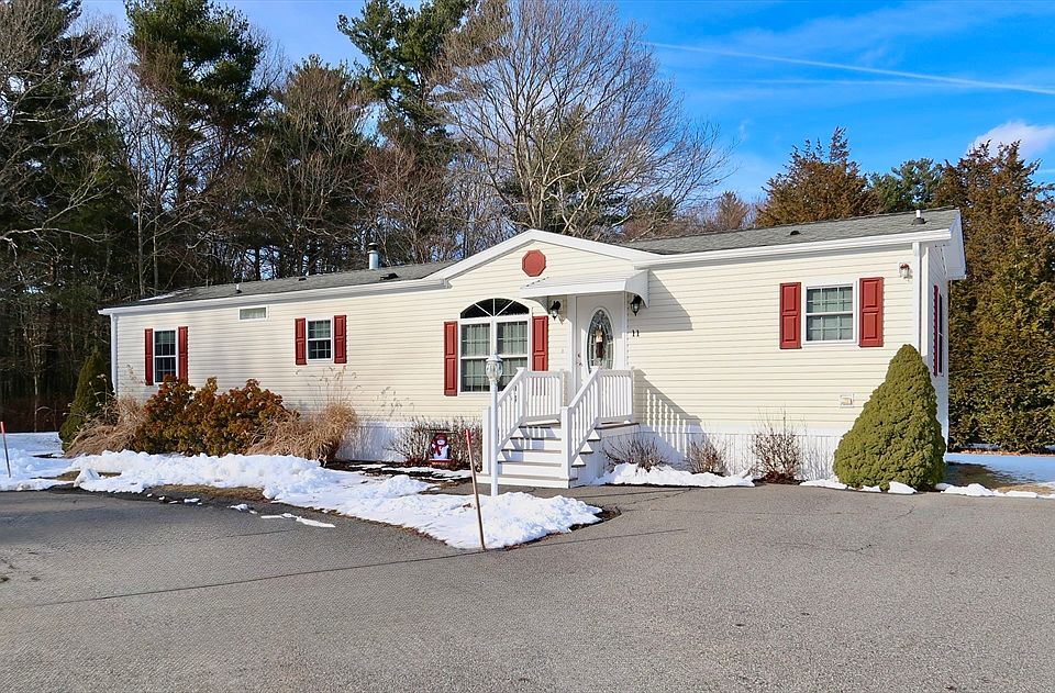 Welcome to this lovingly, well-maintained, 2010-built 2-bedroom, 1.5-bath mobile home in the charming Colonial Estates 55+ resident-owned community. Tucked away at the end of a quiet cul-de-sac and bordering peaceful woodland, this home offers privacy and beautiful natural surroundings—enjoy watching birds and deer right outside your windows. Inside, the cozy living room features a gas fireplace, perfect for chilly evenings watching movies or for entertaining company. Both bedrooms offer ample closet space and wall-to-wall carpeting to provide storage and comfort, with a convenient half bath attached to one bedroom. The kitchen is well-maintained and includes lovely cabinets and stainless steel appliances. Socialize with neighbors at the community center, pavilion, or bocce ball court! The home is set back, providing a private backyard patio, ideal for relaxing outdoors. An 8’ x 10’ shed provides extra storage. Lawn mowing is included. Pets allowed w/restrictions.