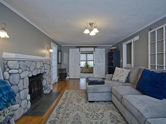 Hints of New England farmhouse bring rustic charm to this Colonial featuring quality craftsmanship at every turn. Beautiful built-ins and hardwood floors throughout are some of the details that create it's welcoming ambiance. A stunning stone façade fireplace in the living room is a real conversation piece when entertaining, and it provides cozy atmosphere when kicking back on the couch. A French door opens to the sun porch and a chic barn door leads to an office/study.An on-trend color palette continues to the kitchen and dining room with built-in bench and shelving. Start your day in style in any of the 3 sizeable bedrooms with hardwood floors, including a master with fireplace, and updated bathrooms. Outside, a fenced-in yard awaits to rescue you from the daily grind, and a new driveway leads to the garage that shelters your vehicle. Plus, a partially finished basement provides bonus rec space. Central air too! It's a must-see!
