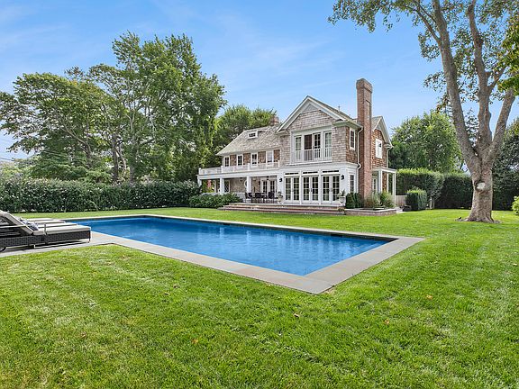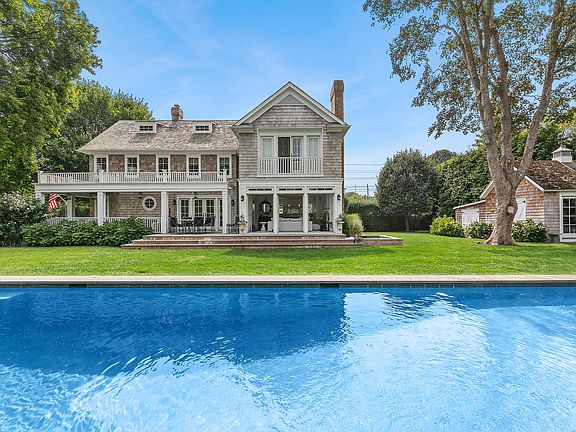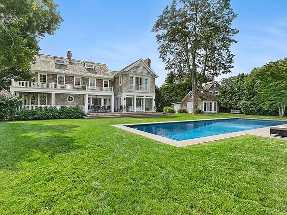 Set on a spacious half acre yet in the center of everything this wonderful home boasts an exquisite design sense. The first floor features a grand entry, library/fifth bedroom, formal dining room, top of the line chefs kitchen, living room with fireplace, all with gracious French doors opening out to the stunning grounds encompassing a new 50' heated gunite pool, pool pavillion with fireplace for glamorous dining, as well as extensive terraces, porches and even a spa. The second floor boasts four more bedrooms including the elegant primary with fireplace and balcony overlooking the lovely property. A rare and charming third floor with sitting room and office completes the interior. A whimsical touch is added by the 'fitness barn', complete with Peloton. Perhaps best of all is the proximity to all of East Hampton's wonderful shops and restaurants just moments away with or without a car!