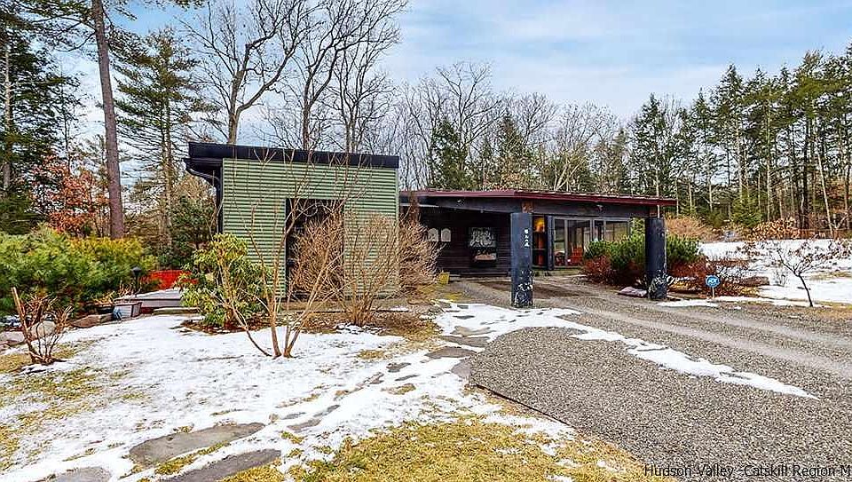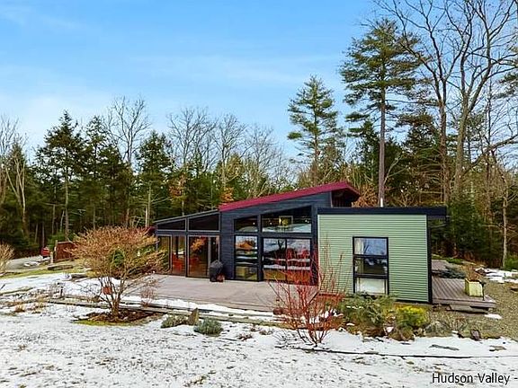 On the market for the first time is a one-of-a-kind modern, zero carbon home tucked away on a private road in Woodstock. Sited on just over 4 acres, this remarkable three-bedroom property with an in-ground saline pool was custom built by its current owner with a special emphasis toward green building and exceptional energy efficiency. Among its eco-friendly attributes are structural insulated panel construction boasting high R values, geo-thermal HVAC system, Lifebreath indoor air ventilation system, VOC-free interior paints, and concrete flooring throughout that maintains the same temperature year-round. As the hallway rounds the corner toward the open living space, you'll appreciate the natural flow between the kitchen, dining, and living rooms. The concrete flooring is complemented with oversized windows and vaulted ceilings, allowing for plenty of light to fill each room. Sliding doors from the dining and living rooms lead to separate outdoor areas overlooking the landscaped grounds on either side. The large center island anchors the kitchen with barstool seating adjacent to the induction cooktop with oversized hood. Granite countertops and built-in range, custom cabinetry, glass backsplash, sub-zero refrigerator, wine refrigerator, and stainless-steel dishwasher are among the many features and conveniences. The bedrooms are strategically placed on opposite ends of the home, separated by the main living area. Each bedroom features custom built-in queen-sized beds and matching wardrobes, with sliding doors leading to their own outdoor space. Although listed as a three-bedroom home, the office could easily transform into a fourth bedroom. The stylish bathrooms feature Kohler tea for two bathtub and Forza stone tile. During the warmer months you'll definitely be spending more time outside by the sparkling pool while taking in the colorful perennials and lush gardens. Enjoy breakfast in the screened porch located off the kitchen. Up above, water lilies complete the small pond next to the gorgeous rock outcroppings and medieval gardens. Your very own stream awaits just across the private road. Conveniently located just minutes to Woodstock, Kingston, and Route 28, 11 Shining Path provides the perfect retreat in which to enjoy all the area has to offer year-round.