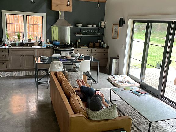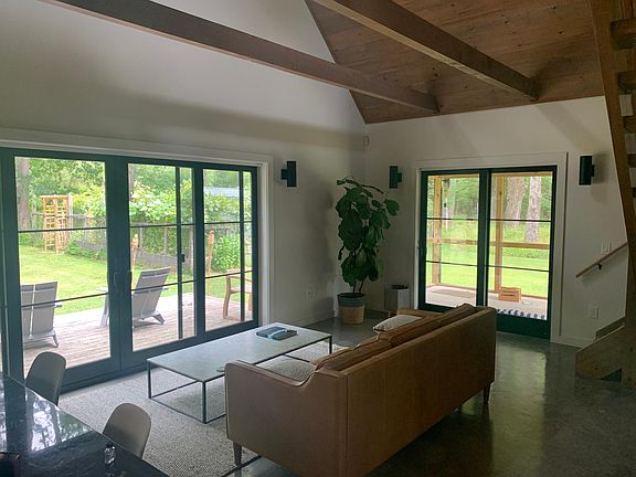 Just around the corner from all the dining and shopping conveniences that the Village of Woodstock offers. This impressive furnished 4-year-old quality-built contemporary blends modern architecture and design with efficient living - complete with views of Overlook Mountain. The property's footprint was carefully planned to maximize use-able space, creating a flexible layout with clean lines and inviting tones throughout. The large windows and sliding doors create a bright and open living space highlighting the cathedral ceiling's stained shiplap finish. Polished cement flooring with radiant heat makes for a comfortable environment year-round. A tastefully finished garage featuring polished cement flooring with radiant heat, half bathroom, and stacked washer & dryer. The garage space was designed with livable space in mind, currently configured as additional living room & Gym Pets approved on case-by-case basis No smoking allowed in the house House is furnished, but can discuss specific arrangements upon application Lawn Care, water and garbage to be paid by owners. Internet, gas and power to paid by tenants. House has small studio with separate power and entrance above garage/living area, open to including for additional rent. Owners otherwise would use occasionally for weekends here and there. The garage is a living space and doesn't come with indoor car storage.