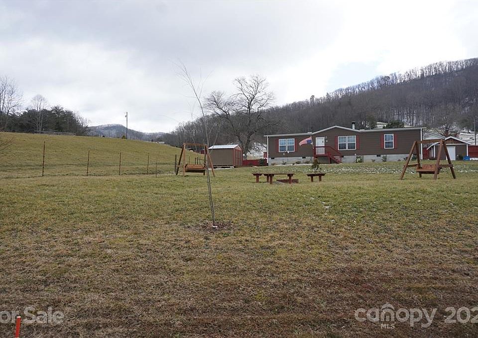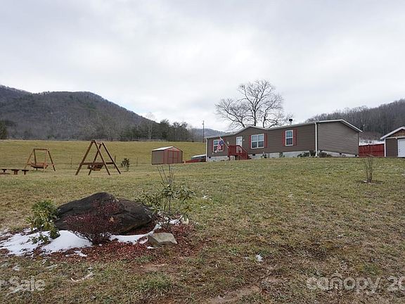 Enjoy gorgeous mountain sunset views from the huge front yard or large living room windows. The living room with a gorgeous wood burning fireplace and bookshelves, opens to a large kitchen/dining area with lots of light and a custom built island. Large master bedroom with a walk in closet and an attached master bath that features a separate shower, large soaking tub and dual vanities. Laundry room on the main floor. Two other spacious bedrooms with a conveniently located second bathroom. The exterior of the home has a storage shed as well as a spacious work shop. Firepit/outdoor seating/wooden swings in the front yard. Back yard is completely fenced with a separate fenced area for pets. Come see this beautiful home with scenic views just 25 minutes from Asheville.