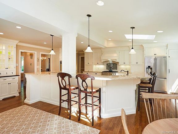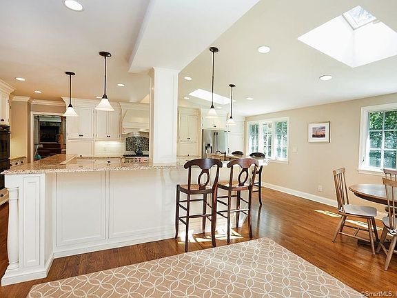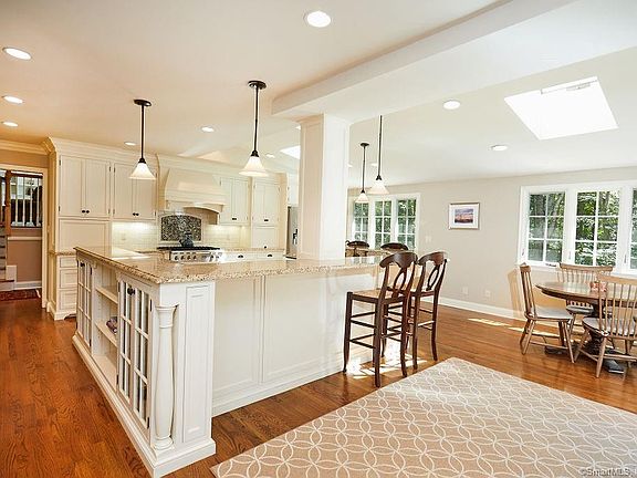 Nestled among the trees on a quiet cul de sac, this 4-bedroom colonial is situated on over 2+ acres of flat, beautifully landscaped property. Lovingly renovated this home is completely turnkey. The oversized eat-in kitchen is a chef's dream with custom cabinets offering plenty of storage, Viking gas cooktop and microwave, refrigerator, Miele dishwasher, Dacor double ovens and a beverage fridge. The large kitchen island with farm sink and wrap around breakfast bar is perfect for gathering with friends and family. Step into the family room with vaulted ceiling, gas fireplace and custom built-ins offering a casual and comfortable respite for watching a movie or reading a book while you relax in front of the fire. Don't miss the master bedroom suite with a walk-in closet and newly renovated bath with a double sink vanity and two medicine cabinets, electric radiant heated floor as well as an oversized shower with double shower heads. Three additional bedrooms, two with California closets and full hall bath with a whirlpool tub complete the upper level. Additional rooms include the formal living room with fireplace and dining room both with bay windows. First floor laundry room, mudroom, half bath, partially finished lower level, deck and private backyard complete this home Great street for bike riding, walking and running. This won't last...first time on market in 35 years