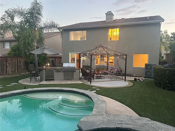 BEAUTIFUL BACKYARD OASIS!! THIS BEAUTIFUL HOME WITH A PRISTINE POOL IS NESTLED ON A QUIET CUL-DE-SAC IN RSM. RECENTLY NAMED THE SAFEST CITY IN OC, YOU WILL FIND ONE OF THE LARGEST LOTS IN THE EMERALD RIDGE HOMES LOCATED IN MELINDA HEIGHTS. THIS HIDDEN GEM BOASTS FOUR BEDROOMS and 3 BATHS in 2530 sq.ft. of Living space situated on a 6659 sq.ft.lot. Step into your home through a beautifully lighted STACKED STONE walkway and onto MARBLE flooring to your spacious Living and Dining area. You will be led to your OPEN CONCEPT GOURMET KITCHEN which seamlessly flows into your GREAT ROOM. The kitchen is a CHEF’s DELIGHT with recently updated cabinets an ISLAND and GRANITE countertops, PANTRY, sleek STAINLESS STEEL appliances, ALL INCLUDED! Enjoy the view of PARADISE through your FRENCH SLIDING DOOR. Relax by the COZY MARBLE FIREPLACE as you listen to music through the built in B&W SPEAKERS.The 1st floor is accented with CROWN MOLDING, PLANTATION SHUTTERS and a guest bath with MARBLE floors. Upstairs you will find a SPACIOUS PRIMARY SUITE perfectly appointed for rest and rejuvenation with updated MARBLE floors a SOAKING TUB, SEPARATE SHOWER, WATER CLOSET, recently updated DUAL SINK VANITY and a WALK-tIN- CLOSET. In addition, there is a FULL BATH AND THREE GENEROUSLY SIZED BEDROOMS, one which has been used as an office. For convenience the LAUNDRY AREA is also located on the 2nd floor, WASHER and DRYER are INCLUDED. An ENTERTAINER’S PARADISE is what you will find in your PRIVATE OASIS. A SPARKLING SALT WATER POOL, with WATERFALLS and a SOOTHING JACCUZI accented with beautiful natural FLAGSTONE. Enjoy SERENITY under a beautiful GAZEBO which sits on a RAISED PATIO. Grill your favorite meals on your custom OUTDOOR KITCHEN which includes a STAINLESS STEEL VIKING GRILL and FRIDGE. Mature trees add to your privacy with additional fruit and rose trees with added gardening beds for your favorite plantings. The home has been FRESHLY PAINTED and has NEW CARPET, LUXURY VINYL FLOORING and a NEWLY INSTALLED HVAC system compatible with the SOLAR PANEL SYSTEM managed by Tesla. Enjoy all that Rancho Santa Margarita has to offer, including the highly rated Melinda Heights Elementary School, RSM LAKE and BEACH CLUB, parks, tennis courts and trails, outdoor music events and more. Excellent shopping, restaurants, and toll roads are all nearby. CALL TO SCHEDULE YOUR PRIVATE SHOWING OF YOUR FOREVER HOME AND BEGIN MAKING YOUR LASTING MEMORIES.