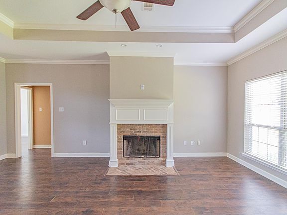 This stylish home offers a blend of comfort and luxury. The kitchen features Corian countertops and black and stainless appliances. The living spaces are adorned with rich laminate wood flooring, stylish ceramic tile and 2" Levelor blinds. The outdoor space includes a 12 x 10 covered patio and a wood privacy fence. The home boasts upgraded fixtures, an 80-gallon water heater, a gas furnace, and a wood-burning fireplace with a gas starter. The split plan layout includes a large laundry room with extra shelving, and an oversized primary bedroom with a boxed ceiling and crown molding. The Dallas-style primary bath features his and hers walk-in closets, a jet tub, and a separate shower. The property is complete with updated landscaping and dryer hookups for either electric or gas. This home is a perfect blend of style and functionality. Make an apppointment to see it today. Agents see remarks
