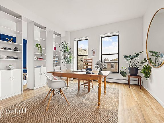 Currently configured as a spacious one-bedroom, the layout is serene and thoughtfully designed, located in a pet-friendly elevator building on a coveted Park Slope block. Perched high on the 4th floor, it offers open views of gardens, flowering trees, and sky—light-filled, peaceful, and serene.