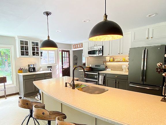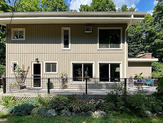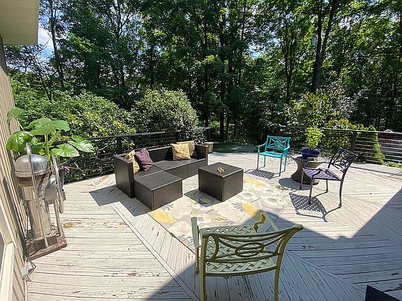 Peace and seclusion. This home is perched atop a wooded hill and affords occupants quiet privacy while being within walking distance to stores, restaurants, and even great trout fishing in a stocked stream. This spacious contemporary boasts 3 beds and 2 baths. The ceilings on the 2nd floor are vaulted and beamed. The first floor is covered by vinyl flooring over a protective layer of plywood. Under that plywood are hardwood floors (past owner did this for wheelchair accessibility). The current owners use a wood stove as their primary heat source and will leave enough wood for many months for the new owners. The wood stove is backed up by electric heat that the current owners report rarely using. Outside the home is a fun back yard with room to play, a lovely deck, a seating area adjacent to the 2 car garage and woods in which to roam.