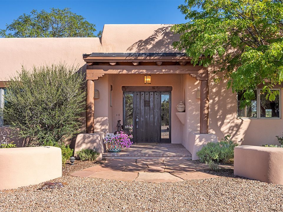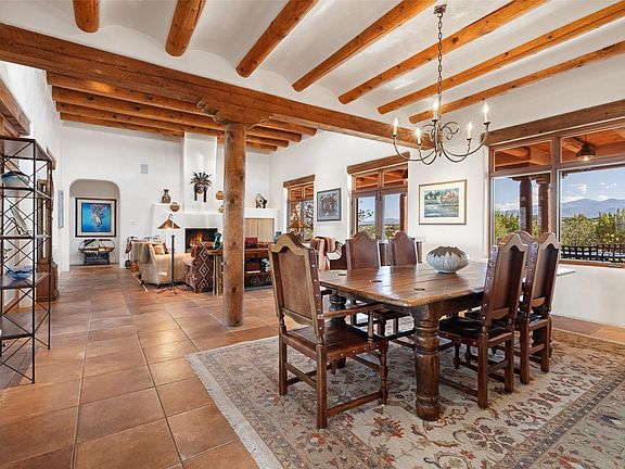 SWEEPING VIEWS OF BOTH EASTERN AND WESTERN MOUNTAIN RANGES ON AN ELEVATED LOT IN SUNDANCE ESTATES WHERE THE NIGHT SKY IS JUST AS BEAUTIFUL AS THE DAY. Designed by Richard Martinez to be a haven with warm architectural accents and superb Santa Fe touches. Set in the coveted Sundance Estates neighborhood, this stunning 3-bedroom, 3-bath home embodies timeless Santa Fe style. Absolutely full of natural light, this 3,351 sqft residence sits on 2.5 acres of mature landscaping, offering peace, privacy, and natural beauty. Inside, traditional vigas, beams, and coved ceilings are paired with creamy plaster walls, wood and tile floors, and radiant heating throughout. Four wood-burning fireplaces anchor the warm and inviting living spaces, while the gourmet kitchen is a delightful and colorful place to cook together or just cozy up with a cup of coffee and the newspaper. It features high-end appliances, and scads of counterspace and storage. Formal and informal dining areas, and seamless flow to outdoor dining patios give this residence high appeal for entertaining. The primary suite offers serenity with breathtaking views, while guest accommodations have their own wing and are equally welcoming with views and privacy. Outdoor living is elevated with multiple patios, a hot tub, and manicured grounds designed for relaxation and entertaining. A 3-car garage and additional driveway parking for 5 vehicles provide convenience. The third bay of the garage was built as a fabulous studio space and could be an art studio, gym, yoga spot, crafts room - you name it! This property is a masterful balance of traditional craftsmanship and modern comfort - an exceptional haven for refined easy Southwestern living.