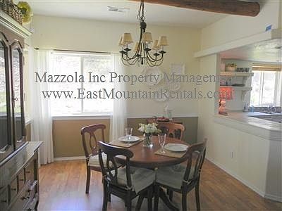 3 Bedroom, 2 Bathroom Home in Tablazon in Tijeras, NM. Beautiful family home on landscaped acreage. Great room with vaulted ceilings and gas fireplace. Large kitchen with all appliances. New hard flooring and window coverings. 3 bedrooms upstairs, master has jetted tub and vine covered balcony. Covered patio opens to play area and lawn. Great views of the Sandia Mountains, a real showcase. Close-in Tablazon Subdivision, 15 minutes to ABQ. Call Liz for more information or a showing, (505) 250-1250.