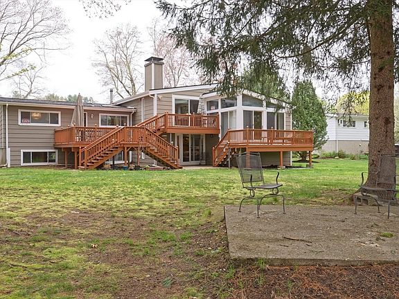 Don't miss this remarkable home! Both den and home office in the lower level could be used as a 4th or 5th bedroom if needed. Situated in a peaceful cul-de-sac, it offers abundant space for various activities, complemented by a stunning backyard boasting tranquil water views of the reservoir. The primary expanded bedroom includes a fireplace and slider to the deck, complete with a hot tub and adjoining exercise room, and even a walk-in and cedar closet. Natural light floods through the cathedral ceilings. The kitchen invites with its updated features, including an island, built-in pantry, ceiling fan, and elegant Corian counters. Custom touches throughout add to the charm of this home. This home features modern amenities including 200 amp circuit breakers, approximately 8-year-old roof, and newer vinyl windows. Home Warranty included. Ready to impress and awaiting its new owners—show and sell!