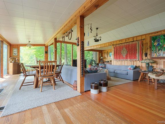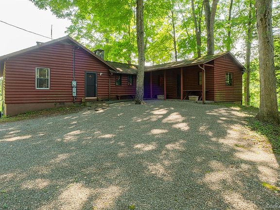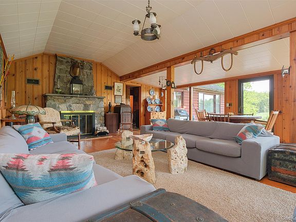 IT IS ALL ABOUT THE VIEW! Discover this 1838 sq ft contemporary real log home on 18.57 acres; offering privacy and breathtaking VIEWS OF YOUR VERY OWN POND.. Embrace nature at your doorstep while enjoying the warmth and character of this one of a kind property. Inside, you will find an open concept layout; the centerpiece is a glass walled great room that floods the space with natural light and frames the beautiful scenery. The home features two oversized bedrooms,. One bedroom has a door to a porch. There is an updated full bath with two large sinks, kitchen with pantry, two wood burning fireplaces-one elegant stone, the other classic brick. There is another very large windowed room currently used as a living/dining/sitting room/all purpose room overlooking the pond. Authentic wood floors on first level; original tongue and groove real wood walls and an original stone patio add rustic charm. Additional highlights include central air, and a one car garage. Washer and dryer hookup in hallway, roof 25 yrs., central air conditioning 15 yrs, well pump 6 months, new septic tank will be installed in August 2025. The lower level (440) square ft. has generous storage space, mechanicals, oil tank and garage. New septic tank August, 2025. Within the last 5 years, flagstone patio repointed, steps from patio to pond have been recemented, new dishwasher and stove. Close to Canopus Lake and Beach, This property is NOT in a FEMA special flood hazard area as per appraisal report and FEMA flood map. Seller confirms that he is not required to have flood insurance. Whether you are relaxing indoors or exploring the expansive grounds, this property invites one to embrace nature. A truly special home, reminiscent of Adirondack style for year round living or a peaceful getaway. House and acreage sold as one parcel. Seller will not consider any contract contingencies regarding any possible subdivision. This property is not a foreclosure!!