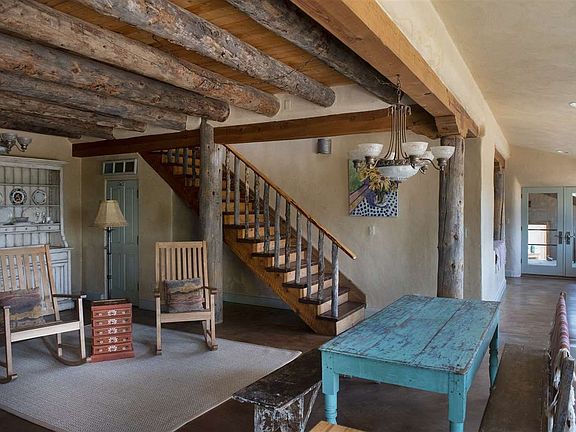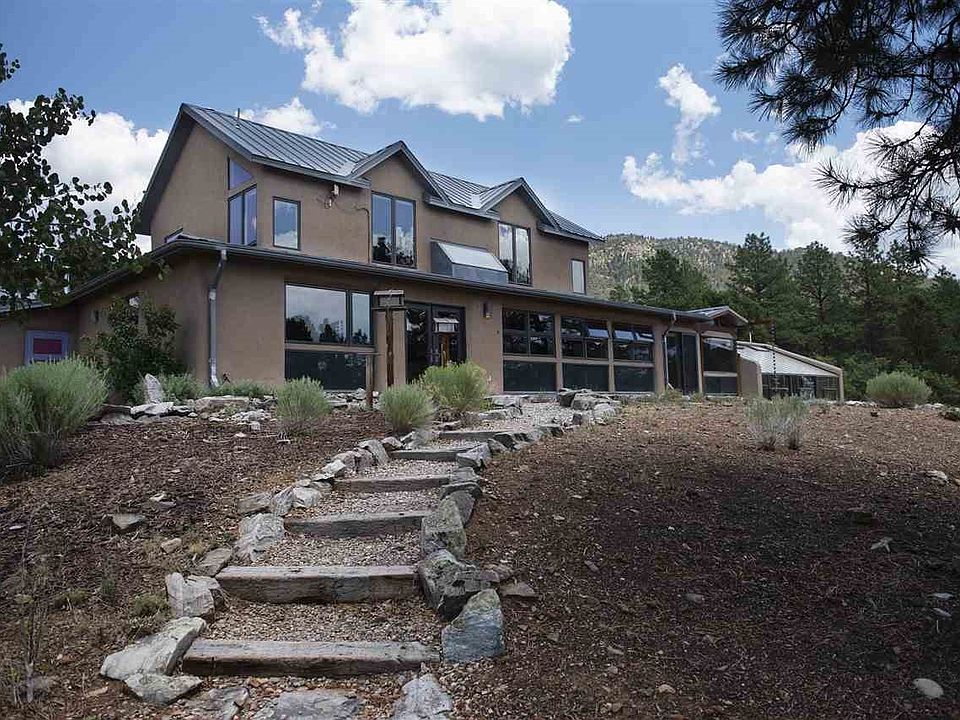 NET ZERO SUSTAINABILITY... Designed to capture the sun and inspirational natural beauty. Escape to the bounty of this private location tucked away on 30 acres in the Sangre de Cristo Mountains above Valdez, NM. This 5,000+ sq ft passive solar homestead, created by an artist and an engineer completed in 2000, is extremely efficient and ideal for fueling creativity with ample makers spaces. The open architecture and floor plan of the main house exudes rustic elegance. Large master suite with library, enchanting master bath with claw foot tub and walk in shower. The country kitchen features flip of the switch well or catchment water at the large farm sink. River rock walled living room with wood stove provides serenity. Sprawling, open upstairs multi-use rooms with views to Pedernal and the San Juan Mountains to the West, Sangre de Cristo Range to the east, the Rio Grande Valley and Mt. Taylor beyond Taos to the South. Detached artist and design studio offers abundant light with an entire southeast wall of windows. French doors to the outside provide fresh air and more work space. Hand pressed tin ceiling adds to the creativity within the space. Guest quarters offer a charming bedroom and bathroom just steps from main house. Grow your own food year round in the solar greenhouse. Store the home grown goodness in root cellar with bonus fireproof, ventilated safe room. Enjoy the outdoors with easy backdoor mountain trail access. Hike, bike, snowshoe, ride horseback from your back door. Ski the World-Famous Taos Ski Valley just a quick 20 minute drive. Net zero design means the house gives more than it takes by use of southern orientation, solar panels, trombe walls, thick pumicecrete first floor walls, straw bale second floor walls and adobe interior walls. The artist studio, guest quarters and solar greenhouse are built of recycled RASTRA. From an energy and construction perspective the structures are LEED comparable. Electrically, the home is grid tied but can switch to the off-grid/solar/battery mode when desired. Careful forestry management for fire protection over many years, meeting USFS standards throughout the 30 acres. Firebreaks around the home can also serve as a helicopter landing area. The land may be further divided. This forested haven combines ecological sensitivity, creator spaces and autonomous mountain living.