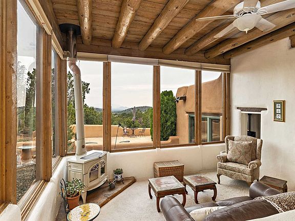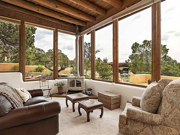 10,000 adobes make this charming one-owner home a cozy delight! Single and double adobe construction, designed by local architect Steve Shaw, make this meticulously maintained home a gem. Details include 2 bedrooms/2 baths with passive solar and electric baseboard heat, large window wall, 3 fireplaces, open floor plan, stone floors, vigas, and custom woodwork all on a 2.2 acre view lot. The outdoor entertaining spaces are beautiful and include a waterfall, decks, fruit trees, a ramada and a working adobe horno (think bread, pizza, etc.). An additional treat is a large studio, office, shop space or kid's playhouse with electricity. Beautiful landscaping on drip irrigation completes this extraordinary property.