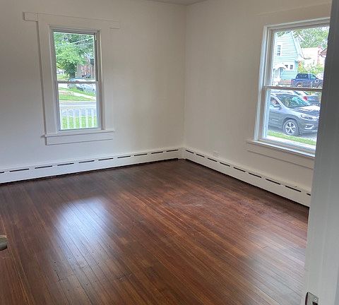 This charming freshly painted apartment has original refinished hardwood floors throughout. This house offers a cozy and comfortable living space, updated kitchen and bath, plenty of windows, front porch, and a full basement with washer/dryer hook up. This property is located in a family oriented neighborhood on a quiet street between the middle school and the elementary school. There is a lush green yard and driveway parking. Rent includes water, sewer and lawn maintenance. Renter is responsible for all other utilities and snow removal. This is a one year lease with no pets allowed.