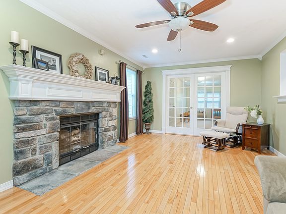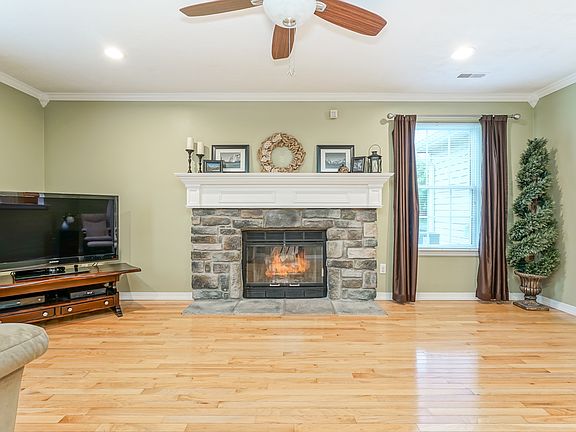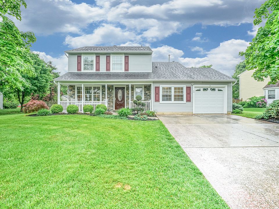 Tastefully updated and meticulously maintained Cambridge model in Country Village! The curb appeal is apparent as you are greeted by the charming front porch with white vinyl columns and railings, stone facade and fresh landscaping. Enter into the foyer with ceramic tile flooring that continues into the kitchen, laundry room and powder room. The formal living room is light and bright with crown molding and a cut out with eye-catching crosshead moulding and trim that leads to the dining room. The dining room boasts hardwood floors, chair rail, attractive light fixture and a view of the beautiful custom built 650sf EP Henry paver patio. The kitchen is bright and airy with updated cabinets, recessed lighting, Corian counters and stainless steel appliance package. You'll just love the spacious family room with gleaming hardwood floors, beautiful millwork and a warm and inviting stone fireplace. Double french doors lead to the spacious main floor bedroom that doubles as a fabulous game room, den or study. Upstairs the main bedroom is painted a warm, neutral tone and has a walk-in closet and ceiling fan. The hall bath is truly a show stopper: beautifully updated vanity, granite counters and grey tile floors grace this truly amazing bath. Two additional bedrooms with new carpeting complete the second floor. Other bonuses include: 30-year Timberline roof shingles (2009), Amish-built shed and shed pad (2015), 95.5% efficient gas furnace (2010) and 16-SEER air conditioner (2010). Within walking distance to Ashbrook school and across the street from the bus stop for all the schools! A lovely home in a lovely neighborhood! Come see what makes this home so special before someone beats you to it!