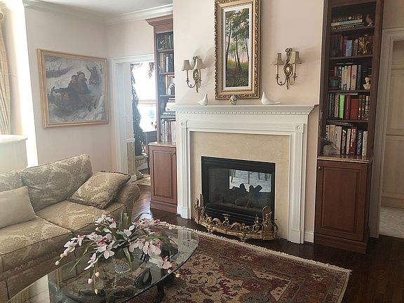 Upstairs are three large rooms and a large marble bathroom with a jacuzzi and skylights. Two of the rooms are bedrooms and another one with builtins and a gas fireplace is used as a den.
