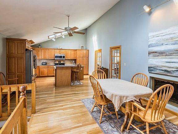 - Kit Dscrp: Dining Area, Flooring - Hardwood, Skylight, Ceiling - Cathedral, Kitchen Island, Stainless Steel Appliances, Fireplace, Countertops - Upgraded