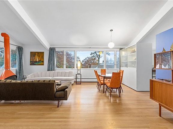 11 West View Avenue, located in the verdant Fruit Hill neighborhood of North Providence, is a very special home indeed. Built in 1959 at the crest of a hill, this mid-century modern gem, known as the “Caldarone House”, was designed by Ira Rakatansky, Rhode Island’s most famous architect from the era. The home has been lovingly preserved by purists over the generations and still boasts most of the original elements. The basics: the home is single-level, with a finished lower level; the home is 3 beds and 2 full baths with 2,251 sqft above grade; 1,400 sqft of finished basement below grade; the home has central AC; there is a two-car heated garage; and the lot is .82 of an acre. Walk in the front door to an open expanse, vaulted ceilings and light from every direction. Your eyes will be drawn to accents, from bursts of color to stained glass to glass partitions to accent walls to design elements like the 8-foot doors and the curio/china cabinet on casters that acts like a moveable wall. On the back side of the house are the spacious laundry room and kitchen that opens to a cantilevered family room complete with fireplace. The railing to the downstairs is artistic welded-pipe leading to recreation room and wet bar with 8-foot ceiling height. The spacious outdoors offers a porch, stone-walled driveway and pebble-stone front entry perfect for sculptures. Entertainer’s dream? Yes, this is truly the affordable showpiece home you have been looking for.