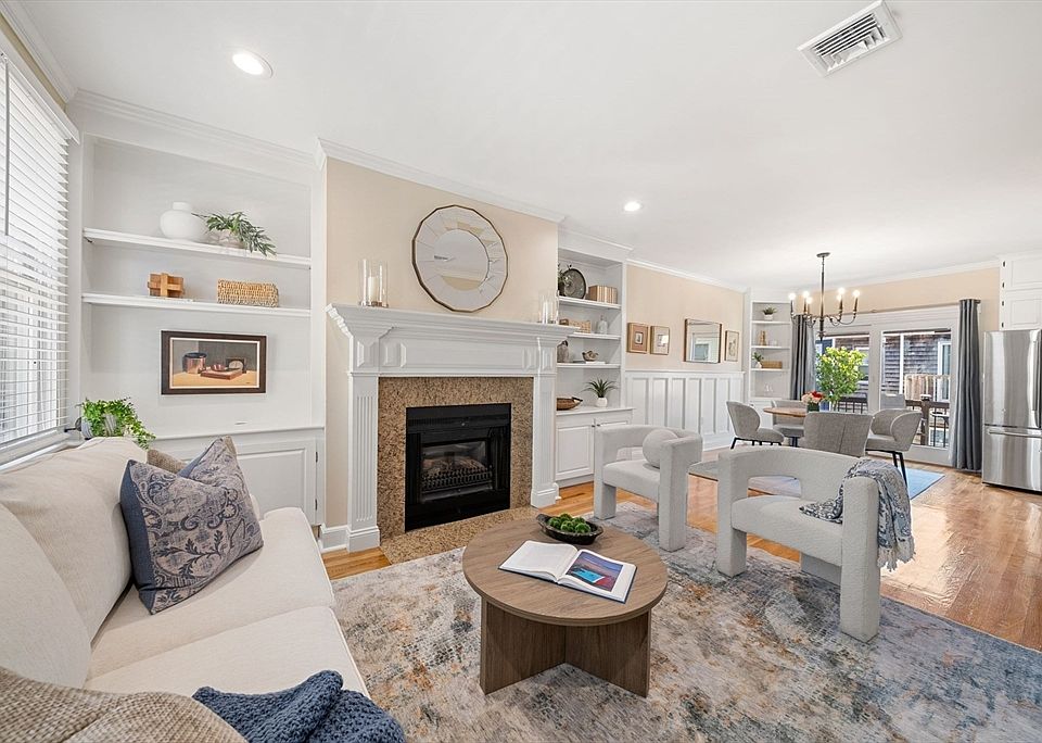 Filled with charm and detail, this beautifully maintained, 2+BR/2.5BA, 1585 sf, single family home offers a highly desirable open layout for entertaining. The elegant living room features a gas fireplace with white mantel, flanked by custom built-ins, and flows to a spacious dining area with wainscoting detail, corner built-in and sliders to deck. The well-appointed kitchen has tall white cabinetry, granite countertops, and stainless appliances. A half bath is tucked off the living area. The expansive lower level media room/in-law suite is perfect for guests or play space and has a gas fireplace with mantel and custom built-ins, sink area, full bath with shower, and large storage closet. Glass sliders lead to a private enclosed garden patio with mature plantings. The upper level offers a king size primary with three large windows, tall ceiling and ample closet space; a spacious guest bedroom w/double wide closet, and a full bath with shower/tub and laundry. Central air conditioning.