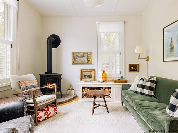 Over the river and through the woods, at the end of a picturesque village lane, sits the enchanting Storybook Cottage. Meticulously maintained and renovated, this beloved 3br/2ba home features all the conveniences of contemporary living—central air and heat, modern kitchen and bathrooms, and oversized insulated windows—balanced with a classic aesthetic that even Goldilocks would agree is “just right.”   Fragrant honeysuckle wafts from the lush Secret Garden in summer months, welcoming you home. Inside, the front parlor with original wideboard pine floors invites you to pick your favorite evening read from the handsome built-in bookshelves and cozy up to the wood stove. Host un-birthday parties in the formal dining room, featuring an elegant wrought-iron chandelier that floats gracefully from the voluminous 9ft ceilings. The updated galley kitchen, awash in natural light from a skylight overhead, opens out to a large deck perched above the grassy rear yard. A pebble-lined seasonal brook meanders through the oversized 1/4 ac lot, which backs up to woods surrounding the nearby Stoney Creek.  A bedroom and full bathroom on the first floor provide options for a first-floor bedroom suite, office/workout room, or guest accommodations. This bedroom contains the laundry, and also opens out to the rear deck—offering a separate entrance or direct yard access. Upstairs are two more bedrooms, and a second full bathroom with beadboard clad walls, a mini claw foot tub, and built-in storage.   The fairy tale hamlet of Tivoli is a tight-knit community in the Town of Red Hook, with a walkable Main Street leading down to a scenic landing on the Hudson Riverfront. Find terrific dining and shopping options just a block from the house—like artisanal scoop shop Fortune’s Ice Cream, and modern apparel and home goods store Winn’s.   The Storybook Cottage is ready for a new owner to write its next chapter. But no knight in shining armor will vanquish the competition that’s sure to seek out this picture-perfect home, so step through the looking glass to see it before it’s gone!