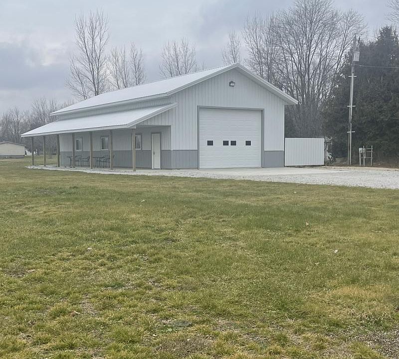 Newer Pole Barn 28x60x14 with 10x60 country porch. Cement floor with insulated double-sided steel overhead door. Electric is installed with led lights and plugs throughout interior. Led lights in the soffits of the porch and overhead door has led light for the driveway. Extra wide drive with 3/4 down limestone. Land Contract available with $25,000 down payment and 2-year payoff with $700 a monthly payments for 2-years then payoff balance at the end of contract with 7% interest.