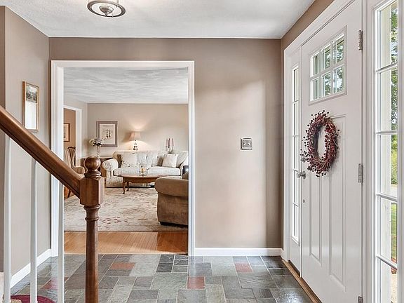 Lovely Colonial located on a peaceful cul de sac in popular Carriage Estates. Pride of ownership is evident throughout this 3 bed/2 bath home to include the bright and light updated eat-in kitchen w/granite, S/S appliances and hardwood floors; large formal dining room for those special occasions; spacious living room and fireplaced family room w/cathedral ceiling (all with stunning hardwood floors), plus a full bath and Laundry. Upstairs enjoy a tranquil master bedroom w/private access to the full bath and two additional spacious bedrooms. Attached two car garage with plenty of storage and improved driveway. Enjoy the large deck overlooking the impeccably landscaped yard with paver patio and plenty of room for your future pool. You will also find a full unfinished high-ceiling'd basement just waiting to be finished adding an additional 900+ sq/ft of living space! These original owners have updated windows, roof, boiler and siding. Move-in ready and easy access to highways & train.