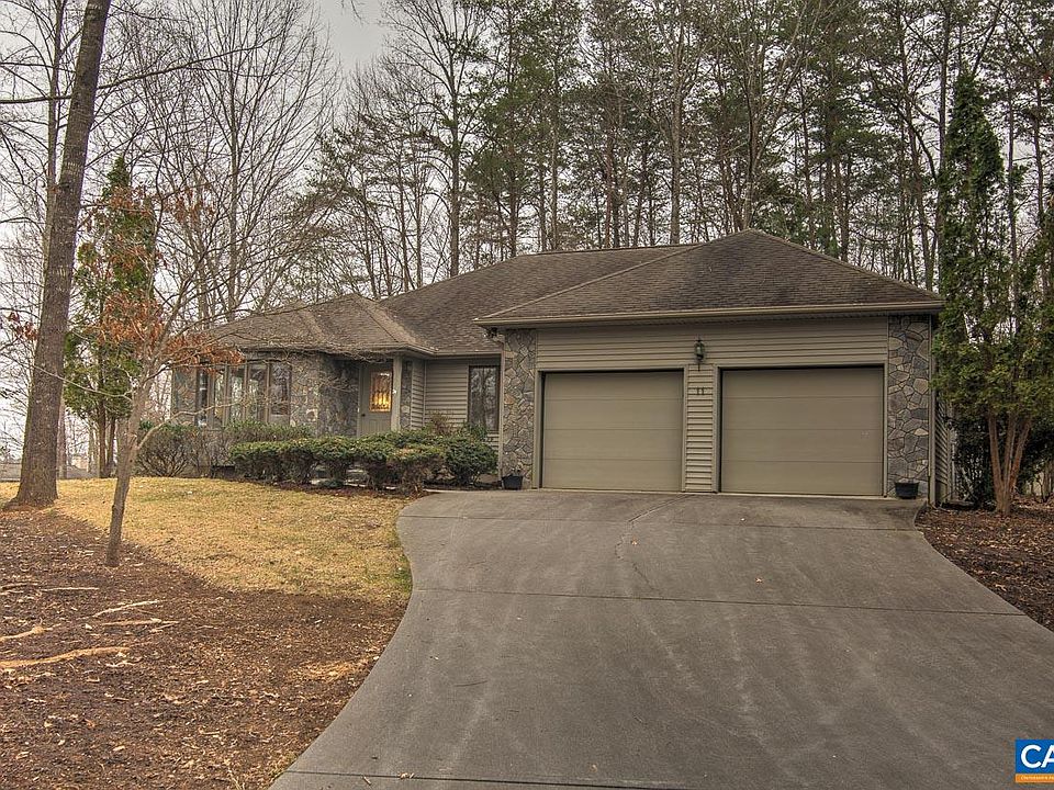 Come enjoy all the best that Lake Monticello has to offer. This is an absolutely charming 1 level living property. Featuring a gorgeous modern floor plan & peaceful lake views set amongst a backdrop of wooded privacy. Curb appeal pops w/multiple roof lines, landscaped yard, stone accents, concrete driveway & walkway. Private formal dining room & living room (w/tray ceiling); both with ample windows capturing the gorgeous lake setting. Living quarters are privately situated in the back of the home. Large kitchen w/built-in stove/micro, island, breakfast bar, gas cooking, walk-in pantry. Beautiful 5 bay window in the breakfast room. Gorgeous morning sunshine in the family room w.gas fireplace too. Solid hardwood floors thru-out. Soak in the jetted tub in the master bath w/wooded views out 2 corner windows. Large bathroom w/oversized vanity, linen closet & walk-in closet. Private guest quarters. Numerous thoughtful touches thru-out this unique property. Several pocket doors allow for a versatile floor plan, easily creating more private spaces & then open concept living. Oversized 2 car garage, HVAC 2016. Excellent section for walking & so close to Beach 2.