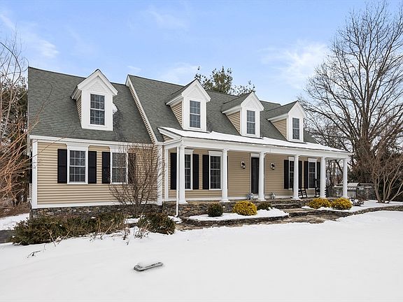 Set down a Long Drive (Paved 2022) sits this Stunning, Young Four Bedroom Cape set on a large 1.95-acre lot with a Private Yard that features loads of stunning Stonework, a Multi-level Deck, an Outdoor Kitchen, 3 Large Blue Stone Patios & a 9-person Hot Tub! Enter through the Farmer's Porch to the Front Door & you will find lots of attention to detail around every corner! An Open Floor Plan connects all the Main Living Spaces & features Hardwood Floors throughout & a Kitchen-Family Room with an Exquisite Floor-to-Ceiling Custom Stone Gas Fireplace. The Kitchen features an Expanded Island (2022) new Countertops & Sink. (2023) A Separate Dining Room, Livingroom & Powder Room as well as a Private First Floor Main Bedroom Suite that boasts a Large Bathroom with an updated Shower/Bath (2023) complete the 1st Floor. Upstairs you will find 3 Bedrooms & an Updated Full Bath (2023).The Walk-out Lower Level could be finished for additional Space! Conveniently located near Shops & Commuter Routes