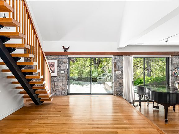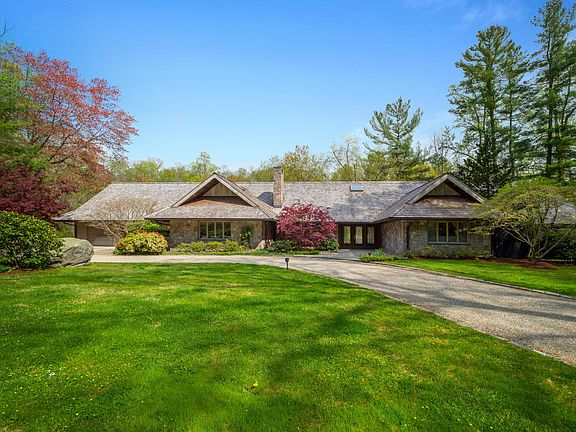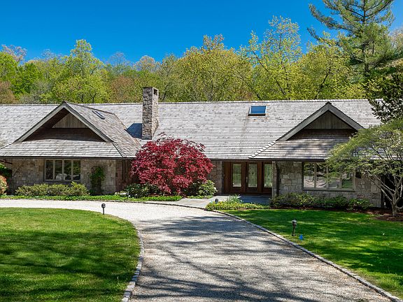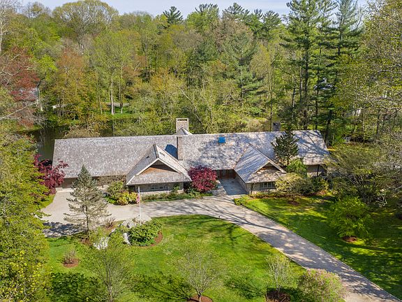 Frank Lloyd Wright-inspired masterpiece on 2.15 serene acres on coveted cul-de-sac just minutes from downtown Greenwich. Streamlined geometric designs, open floor plans and soaring roof lines. Meticulously maintained 5-bed, 5.5 bath house featuring luxurious master suite with privacy, Japanese gardens, built-ins and plenty of storage. Hardwood floors and light-filled windows throughout for easy living. Mature landscaping and specimen foliage envelope the property overlooking Horseneck Brook and Pond. Fish and canoe in the summer, ice skate in the winter or relax on the extensive outdoor terraces. Pristine outdoor pool with 60 foot lap lane, 2-car attached garage. New to the market. Convenient location, incredible architecture and enviable setting are unrivaled.