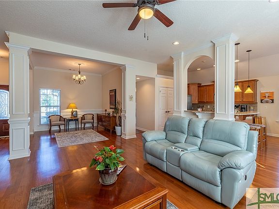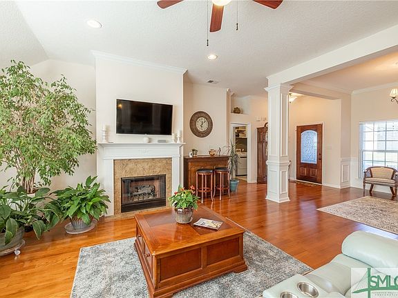 Don't miss out on this well-maintained all-brick home in the coveted Highland Falls neighborhood, located within the Pooler area's reputable community of The Highlands! Convenient to Gulfstream, Georgia Ports, Savannah/Hilton Head International Airport, Tanger Outlets, and all that Pooler has to offer. The home features a beautiful open floor plan with real hardwood floors covering all main living areas. Ornate columns, upgraded moldings, high ceilings and a gas fireplace accentuate the living space which also boasts a formal dining room and separate breakfast area plus bar. The kitchen offers granite, stainless, tile backsplash and pantry. Three bedrooms including owner's suite are situated on the main level, with a 4th bedroom, full bath and double closets located upstairs. The exterior is highlighted by a screen porch, additional patio space, spacious yard and rear wooded view. All appliances including washer and dryer remain with home. This property is NOT in a flood zone!