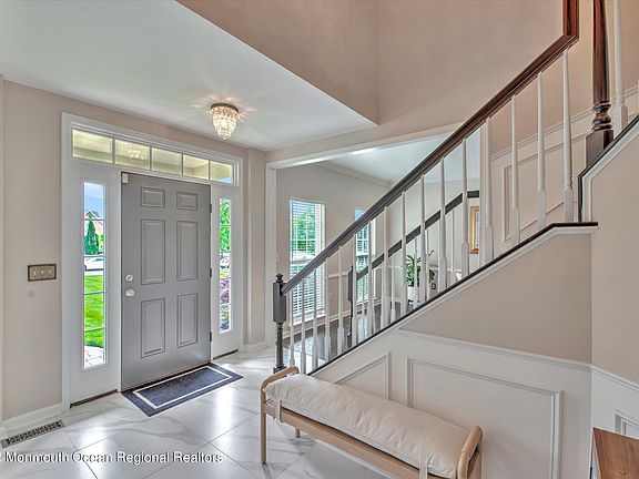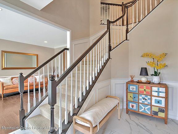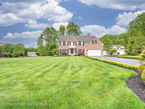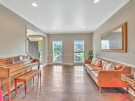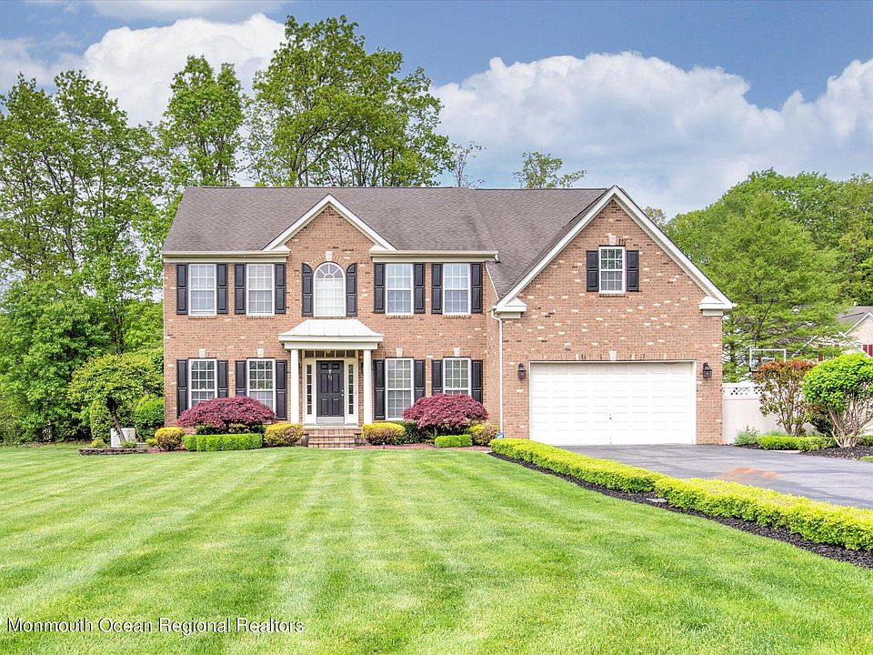 ELEGANCE describes 5 BR, 3.5 bath home in highly desirable ''Turnbury Estates''. Walk into two story entrance with white porcelain tile flooring leading to NEW STUNNING WHITE CUSTOM KITCHEN just recently completed. Kitchen boasts center island, with stainless steel appliances, custom backsplash and Quartz countertops with separate breakfast area leading out to yard. Step down from kitchen into spacious great room with gas fireplace, engineered wood flooring and floor to ceiling windows for family gatherings. Additions to first floor include library/office with French doors, spacious living and dining room both with engineered wood flooring! Upstairs boasts large primary suite w/sitting area, tray ceiling, large walk-in closet and bath with his/her vanities. Two BR with jack & jill bath, BR with en-suite bath and 5th large BR complete this second floor, not to mention second staircase leading down to family room! Neutral paint and Custom moldings throughout this amazing home! Enjoy the finished basement to make your own! Walk outside to backyard with paver patio, built-in pool and basketball court for entering guests and family! Home is equipped with whole house generator, security system, 2 car garage, and beautifully manicured property! Close to major roadways, shopping and the beautiful Jersey Shore. This home is designed for entertaining and luxurious living!