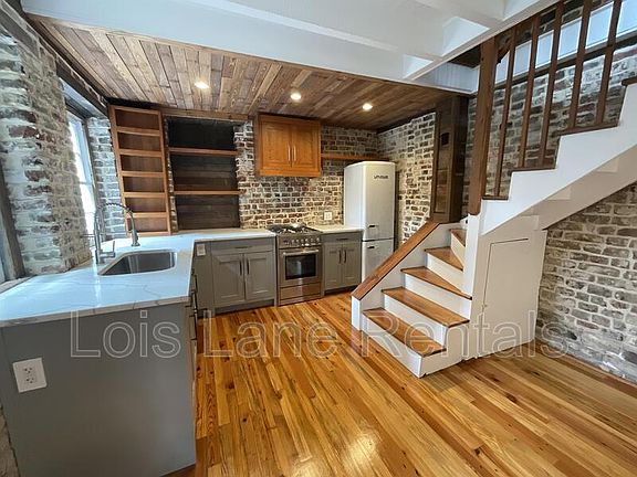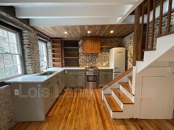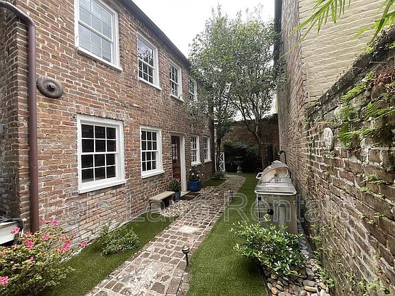 Rare find South of Broad! Newly renovated carriage house tucked away in the heart of the Historic District. This one-bedroom, one-bathroom two-story house has heart pine floors, exposed brick and many light-filled windows. The first floor features an open living room and kitchen featuring custom cabinetry, quartz countertops, open shelves, and a gas range. Upstairs is a spacious bedroom with vaulted ceilings, built-in armoire and an ensuite bathroom with a tub/shower. The outdoor space has an inviting walled courtyard surrounding the home. Walking distance to dining, shopping, galleries and more. Application fee is $75 per adult. Available December 1st for a one year lease term.