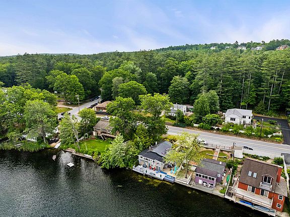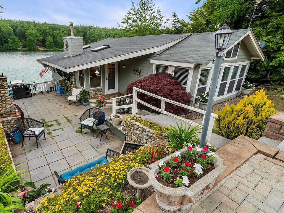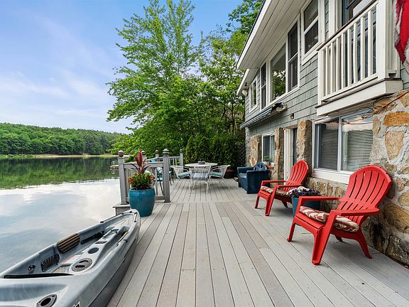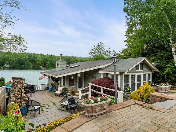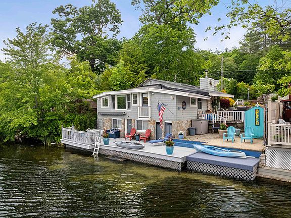 Welcome to Silver Lake in the BEAUTIFUL town of Hollis, NH... Relax and enjoy this one-of-a-kind property while sitting on your private LAKEFRONT deck and/or take full advantage of the water with kayaking, canoeing, fishing, swimming and more! In winter months enjoy ice fishing, snowmobiling and ice skating.The exterior of the home gives the feel of your own tropical hide-a-way. Utilize the large stone fireplace on your patio in the evenings with guests. For added convenience, there are 2 small changing areas built into the backside of the house. Easy peasy! The large shed is great for storing kayaks, canoes and other equipment/accessories. The inside is a RARE find as well! As you enter, you are greeted with an open concept living/dining/kitchen area featuring skylights along with a floor to ceiling stone fireplace for winter warmth and ambience. The back living room area of the home overlooks the lake with a wall of windows for an exquisite view. Head towards the double doors leading you to your primary bedroom escape with an abundance of natural lighting and wood stove insert. An additional bedroom is located off of the kitchen area perfect for guests or an office. Property is set in a primary location close to farms, trails, conservation land and a minute to Silver Lake State Park. Hollis, NH has an award winning school district and offers many more amenities. View this serene, all season home TODAY. ***OPEN HOUSE WED 5 TO 7P, offers due Thursday 6/15 by 3pm***