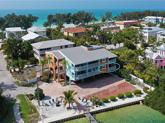 Spectacular views of the Intracoastal Waterway from this gorgeously updated 2 bedroom condo, with detailed custom features. A boaters dream, this property comes with a private boat slip with a lift. Enjoy having the intracoastal as your backyard, and the Gulf of Mexico just a few steps away. Sip your coffee on the porch as you enjoy the sunrise. Walk to nearby restaurants and entertainment on Bridge Street. A truly perfect location to enjoy all the island has to offer. Offered turnkey furnished. The additional $250 per quarter is added to reserves for future painting of the building.