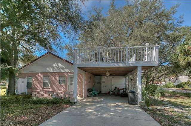 FANTASTIC LOCATION only one block from the beach. Concrete block construction with a carport and a large deck overhead. This 3BR/1BA single family home sits on a large 100x100 lot and is a great little cottage. Roomy kitchen with all appliances included in the sale along with some furnishings and decorations. Beautiful oak trees on your lot and in the desirable "X" flood zone where no flood insurance is required.
