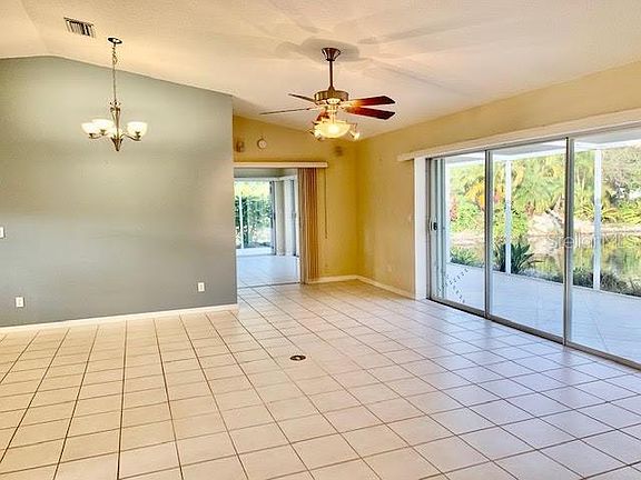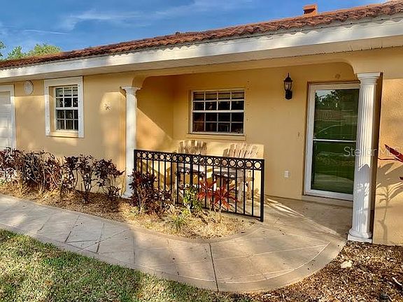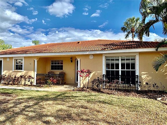 For Annual Lease! Charming spanish- style bungalow in the 55+ community Palms of Manasota! This maintenance-free 2 bed/2 bath with den home checks all the boxes! Light & bright, open plan with great room layout with living/ dining all taking in a stunning view! The kitchen recently updated with new cabinets, creative storage, breakfast bar, stainless appliances, granite countertops and great lighting! A bonus pantry wall and utility room with storage is just steps away. Thw master bedroom features a walk-in closet, linen closet and completely transformed en-suite with jetted tub, and separate shower with rain head and body jets! Additionally a wonderful den, just off the living area, features tile floors and walls of sliding doors to let nature and light in. A "wrap around" lanai offers over 60 feet of screened entertaining space and incredible views to 2 ponds, oak trees canopy, a waterfall and fountain! A 1 car garage with storage, cup-de-sac street and quick access to ST Pete and Sarasota make this one a winner!