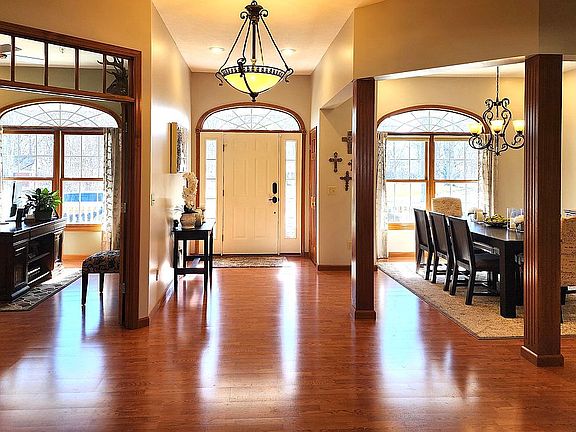 Entryway with chandelier, Floor-to-ceiling gas fireplace with new carpet, ceiling fan, tray ceiling, recessed lighting