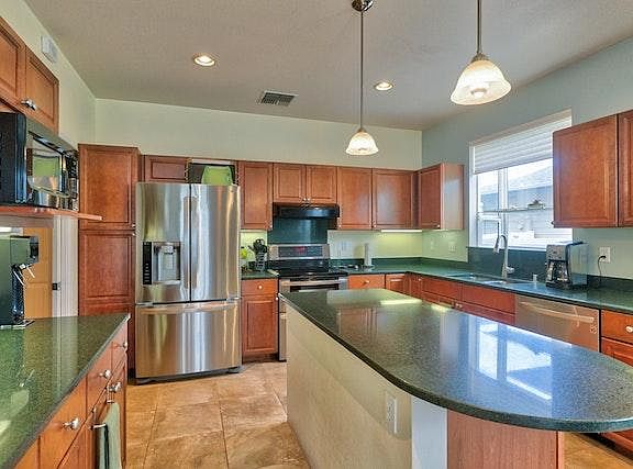 Immaculate, squeaky clean 4 Bedroom / 2.5 Bath Home For Rent In Kahului/Maui Lani/Na Hoku Neighborhood. Centrally located, near schools, hospital, shopping, huge sports park. Large, 2 story, well maintained, clean as a whistle, partially furnished home with large fenced yard. 2nd floor lanai off master with fabulous views of West Maui Mountains. Located on a corner lot in desirable Na Hoku neighborhood. No smoking, Central AC, PV system, water, trash included. $3950 per month. Owner pays for trash and water. Renter pays for electricity. PV on roof averaged electric bill $27/month for past tenant who loved the house but purchased another. Gourmet kitchen. Extra fridge in garage. Fabulous property. Partial furnishings are beautiful 4 poster bed and office desk, chair and filing cabinet.
