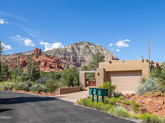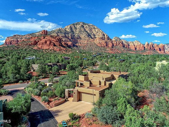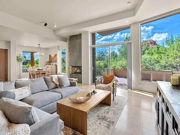 Southwest Luxury and Elegance abounds within this beautifully appointed Custom West Sedona Gem built by Casa Natural. With STELLAR Red Rock views of Thunder Mountain and Chimney Rock, get ready to fall in love the moment you pass through the entry gates. Privacy and Zen-like tranquility delight the senses combined with the perfect location with easy access to hiking/biking trails, shopping and dining. Creatively and masterfully designed with UPGRADES GALORE featuring Great Room Living with 10 &12 ft ceilings. Upon entering, the massive stacked rock wall invites you in, creating harmony with the red rock views through a generous array of glass windows. Several interior walls are angled, all with rounded corners complemented by gorgeous Travertine floors, majestic 8 ft wood doors and rich cabinetry throughout. Native Trees provide privacy from every room creating the feeling of remoteness and connection to nature.