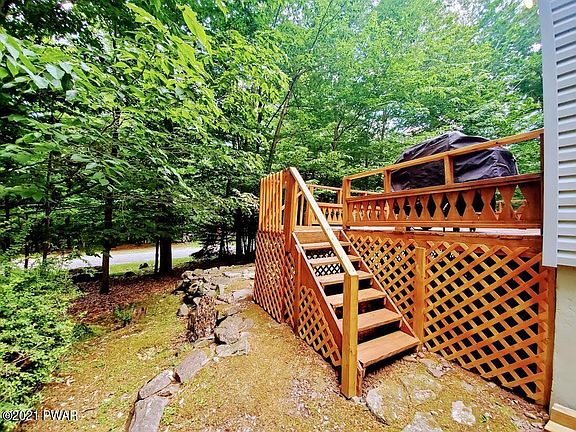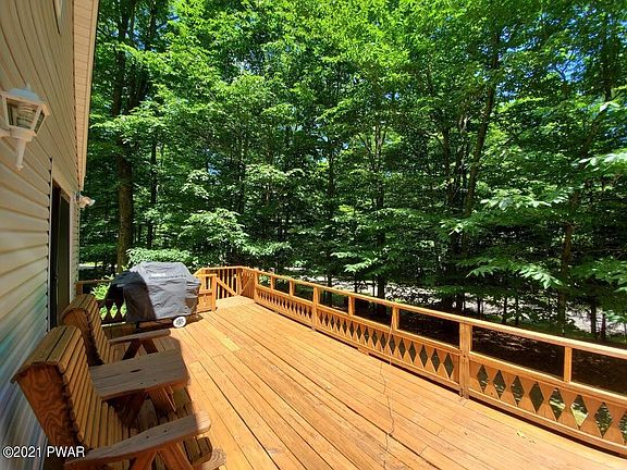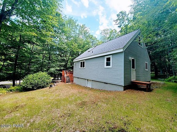 This Cozy Mountain Chalet is the perfect vacation retreat! Located in a small community, that borders state land and has a private non motor boating lake, is ideal for the family looking to escape city living. Home features 2 bedrooms with T&G ceilings, an oversized sleeping loft, 2 large sheds which are perfect to store your ATVS, a newly refinished large deck, and located on a beautiful wooded corner lot. Located just minutes to Promised Land State Park, Lake Wallenpaupack and other Pocono attractions. Home is being sold furnished.
