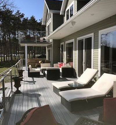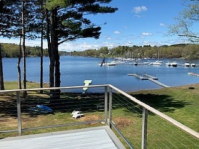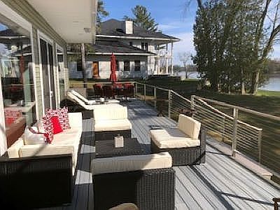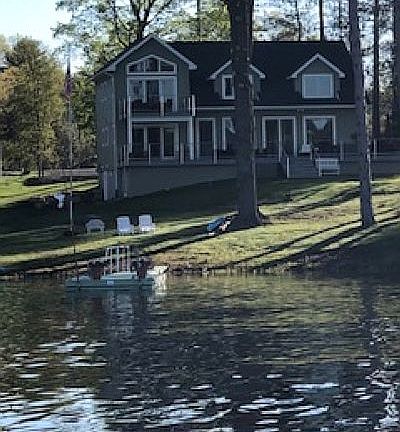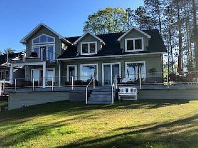 Custom built contemporary lake home with 100’ beachfront. 2 master bedrooms with en-suite, 2 guest bedrooms with shared bath. Open concept. 1200 sq ft of Trex Deck, amazing views of the lake from every room. On quiet private drive. Gas fireplace, open staircase with cable railings inside and out. Propane gas for furnace, fireplace, stovetop and outdoor grill. Central AC. Sq ftg includes garage and bonus room (with bedroom) above garage.