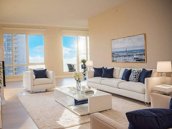 Sleek gas fireplaceOpen-concept designPrivate balconyHarbor viewsLarge islandCity viewsChef-inspired kitchen