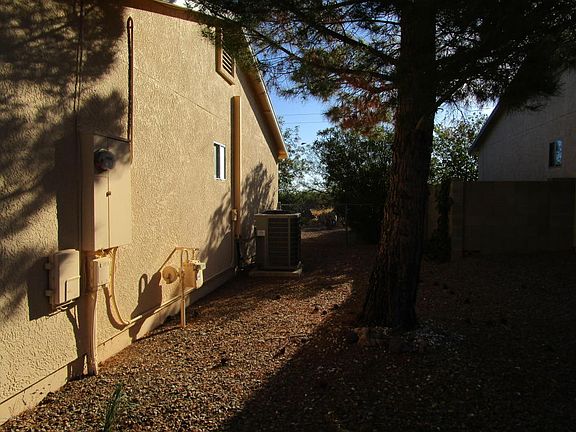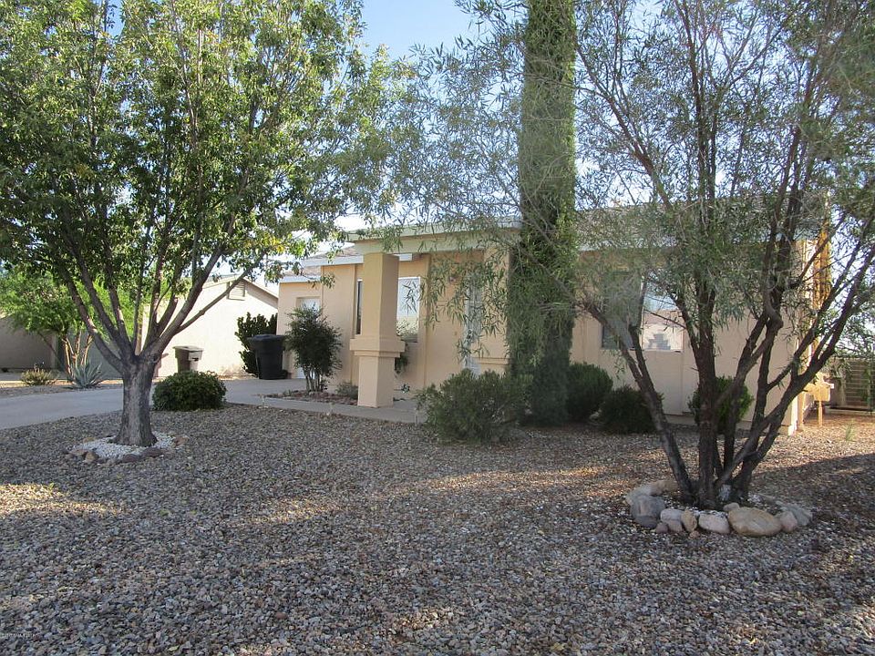 Absolutely charming and move in ready. Customized with laundry in kitchen and built in shelves in living room. Extra deep garage. Not an inch of wasted space. Comes with washer, gas dryer and Fridge. Newer shingle roof, large A/C. Lived in very gently. Back yard is next to East range of Ft Huachuca, so no obstructed views from covered patio.