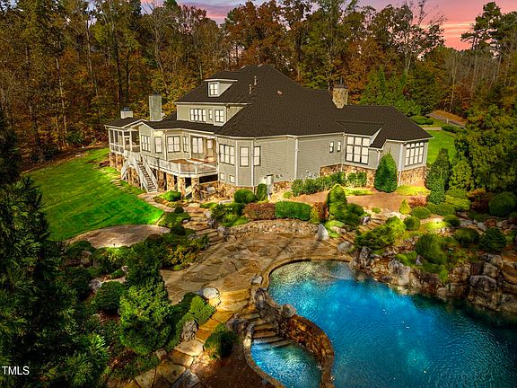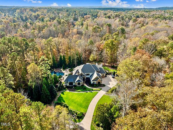 Upscale 7250 sq-ft Estate within The Shire subdivision located minutes away from Chapel Hill downtown. Property sits on 10 acres of secluded landing creek. Home features many upgrades including a $200K spectacular 1042 sq-ft office/library addition room covered entirely with exotic African tree ''Sapele'' wooden panels, massive fireplace, warm drawers, a built in ''Full Swing'' industry leader golf simulator that can be also used as a TV projector, features include a world class Creston system controlling entire property lights, office windows w/automatic blackouts shades, TV's and more. Resort Style incredible heated swimming pool meticulously designed inch by inch that has to be seen to be believed, owner spent $800K to build this masterpiece that has a adjacent lower spa, 3 waterfalls, a rock slab jumping board and a water slide, pool design is made with rocks brought from Virginia mountains and placed one by one carefully creating an spectacular design that includes special lighted landscaping w/tons of grown plants and trees around, a must see! Master suite is in main level along with second bedroom with en-suite full bathroom. Ample dining room, family with fireplace, oversize kitchen areas with top notch stainless steel appliances, gourmet island, granite tops, 2 sinks, wooden cabinets, crown molding & more. Upstairs there are 3 bedrooms with en-suite bathrooms, a large bonus room, access to 2 attics floored storage & a media room. Third level has en existing exercise room with private bathroom that can also be used as the 5th bedroom, there is also an attic storage room. Property has a mud room, a nook room and laundry room all next to the oversized 3 car garage with individual air conditioner/heater system. Outside property has a re-build deck, screened-in porch with fireplace and a pool house with half/bathroom, bbq-built grill, generator, a beautiful area with a fire pit overlooking the private Morgan creek and the extensive 10 acres of forest that encompasses the property. Front side has a long driveway entrance and an extensive and expensive lighted landscaping designed, service entrance and more!