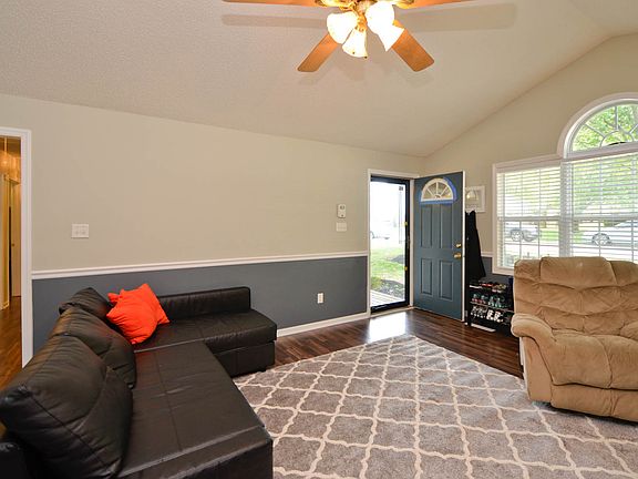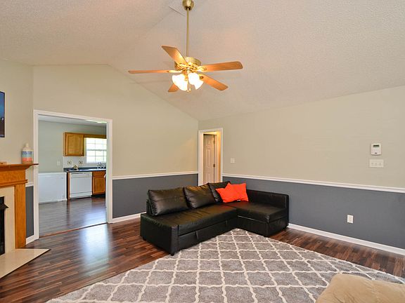 Bring your rocking chairs for the front porch of this well-loved ranch on a cul-de-sac street. Freshly painted in soft greys with walnut laminate wood flooring throughout and tile in the baths. Living Room is spacious with a gas log fireplace, vaulted ceiling and large front window. Eat-in Kitchen opens to Living Room; refrigerator conveys. All windows have 2" blinds and there are ceiling fans in most rooms. Storage building is 16x12.