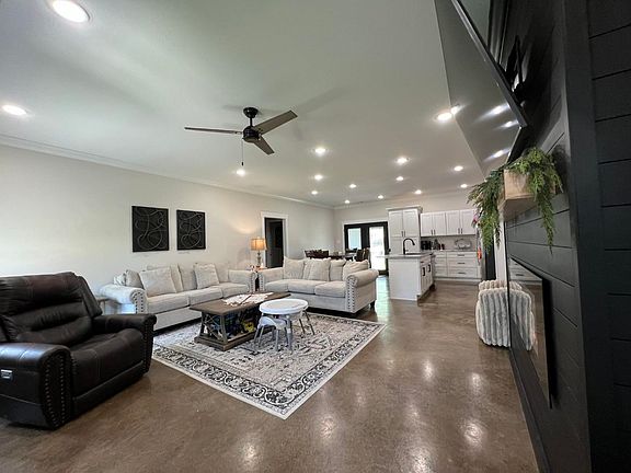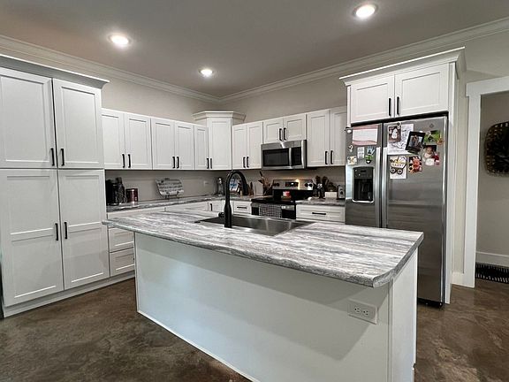 Beautiful white/black shop house in Bay AR, about 3 years old. This home has 3 roomy bedrooms, 2 full bathrooms, front and back porches, and a privacy fenced backyard. The home is a split bedroom plan with the laundry room and tankless gas water heater located on the Primary bedroom side. The suite has a double vanity with drawers and linen storage, a separate water closet, tub/shower unit, and nice walk-in closet. This home has easy-clean stained concrete flooring throughout, and beautiful paint colors have been chosen. The dining area has French doors opening to the back porch and fenced backyard. You should tour this home in person.