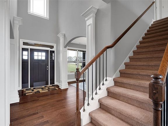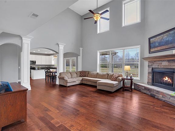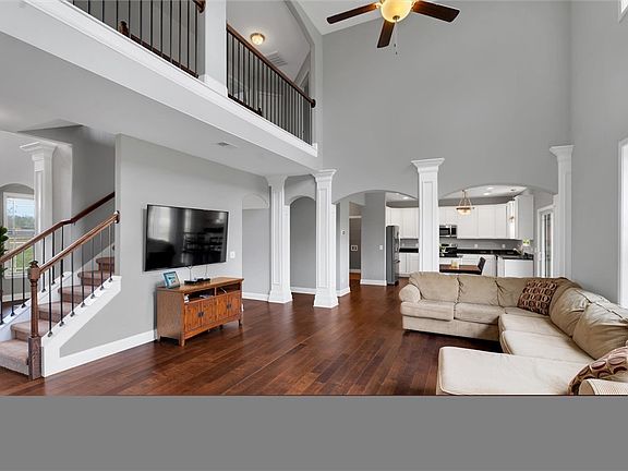 Spearman & Wren School District is where this custom built home is located on 3.65 acres. Drive up to this home with beautiful curb appeal from the stone accents, vinyl cedar shake, and metal roof highlights in areas. Enter through the front door with it’s side lights and transom. You will be greeted by a two story open foyer, arch door ways, and decorative columns. Formal dining room is on the left and study on the right with wood floors and nine foot ceilings. Straight ahead you will see the rock fireplace with gas logs in the family room. Featuring 18 ft ceilings and banister railings overlook it from above. The kitchen, separated by archways and wood trim, features solid surface granite countertops along with stainless steel appliances. Go upstairs to the large master suite with a trey ceiling along with a large bathroom that features two sinks and a walk in shower with dual shower heads and rain fall shower head. Four bedrooms are upstairs and one down stairs. Come see this custom built five bedroom home today.