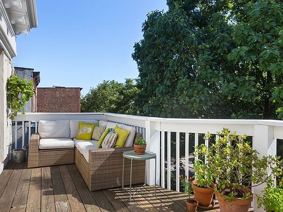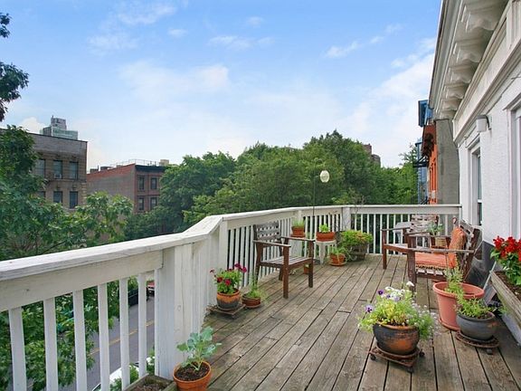 110 Clinton Avenue is a pre-Civil War mansion on Clinton Hill's mansion row. It was converted into a co-op in the mid 1980s and has been charming its occupants ever since. Each and every apartment has its own outdoor space and there are communal benches and walk ways on the building's double wide lot. What could be more romantic than relaxing on an expansive balcony nestled alongside the branches of a giant Northern red oak and being visited by blue jays and red cardinals?! Accessed through the kitchen, this ample space is perfect for entertaining and seamlessly allows for indoor/outdoor living. There's plenty of room for both lounging during the day and dining under the stars at night. With windows on 3 sides as well as 4 skylights, the apartment is flooded with light on even the gloomiest of days. Imagine sitting in this delightful living room complete with hardwood floors and a decorative marble fireplace where you can watch the clouds scudding by from your sofa! The building has a laundry in the basement as well as bike storage and shared storage. It is collectively and lovingly self-managed, and expertly well maintained with a strong sense of community. Capital improvements are planned and funded well in advance. A short stroll away is the oasis of Fort Greene Park and the convenience of the stores along Myrtle Avenue as well as the massive new Wegmans, Russ & Daughter's shop and the ever evolving Brooklyn Navy Yard.