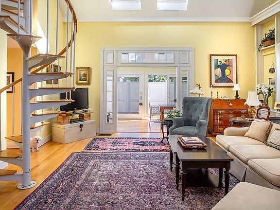 This enchanting carriage house, circa 1935, was most recently redesigned by the nationally known preservation architect, Max Ferro, for his personal residence and offers a private setting within New Bedford's historic district. An abundance of natural light fills the home, courtesy of eleven skylights and an expansive, enclosed sun room. A dramatic open floor plan is highlighted by floor to ceiling custom cabinetry, shuttered windows, an 18 ft ceiling and a winding staircase leading to a private bedroom with updated full bath. Two first floor bedrooms feature french doors which lead to a sun dappled brick patio complete with specimen trees and flowering perennials. A full bath, office with loft, and an interior "utility shed" with direct patio/deck access complete the first floor. This sophisticated home exudes historic charm whilst affording all the amenities and comfort for modern day living. A very special place to call home!